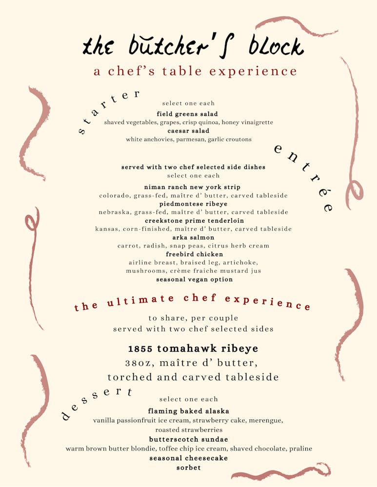 The Butcher's Block is $350++ per couple and does not include beverages. Full beverage menu is available to order. Reserve your spot.
